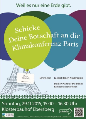 Nähere Infos unter: http://www.energiewende-ebersberg.de/Events/470/Schicke_Deine_Botschaft_an_die_Klimakonferenz_Paris.htm
