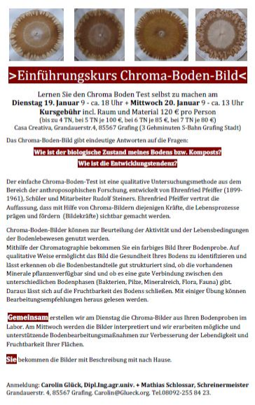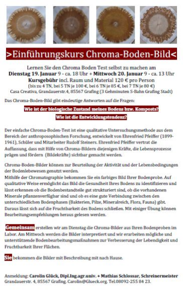 prägen und fördern (Bildekräfte) sichtbar gemacht werden. Chroma-Boden-Bilder können zur Beurteilung der Aktivität und der Lebensbedingungen der Bodenlebewesen genutzt werden. Mithilfe der