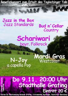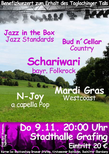 Seit vier Jahren wehren sich Taglachinger Bürger gegen den "Plan, ihr bislang unberührtes Tal durch ein Gewerbegebiet zu zerstören". Nun hat die Initiative ein Benefizkonzert auf die Beine gestellt, deren Setlist sich absolut sehen lassen kann. Etliche renommierte Musiker aus dem Landkreis haben sich bereit erklärt, auf eine Gage zu verzichten und so die "Schutzgemeinschaft Taglachinger Tal" zu unterstützen: Die Kult-Band Schariwari, die gerade 40-jähriges Bestehen feiert, wird mit ihrem bayerischen Folkrock begeistern, Mardi Gras, ebenfalls im Landkreis bestens bekannt, sind Spezialisten für Westcoast- und Folk-Oldies, Jazz in the Box aus Grafing steuert Standards bei, N-Joy steht für A-cappella-Pop und Bud n' Cellar bereichert den Abend um Country-Songs. Das Benefizkonzert findet statt am Donnerstag, 9. November, um 20 Uhr in der Stadthalle Grafing.